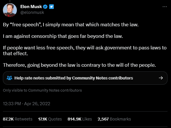 It’s all just vibes now. As Musk shows, he doesn’t care about free speech when it makes his life easier. In this case a government (Turkey) trying to censor and he has all the excuses in the books as to why he should go along with it. Standing up to government authoritarianism is the most important battle for free speech (university silliness is very much secondary), yet the ‘pro-free speech libertarians’ who support Musk will still excuse this. Some are saying that he can’t do anything because there would be repercussions. Maybe, but that’s hardly the hallmark of a stalwart defender of free speech, as Musk sells himself as. It’s one thing standing up for free speech against annoying and blinkered activists with no political control, it’s another when standing up against a real power. The latter is a lot more dangerous and tests someone’s true principles, and Musk has failed. Miserably.