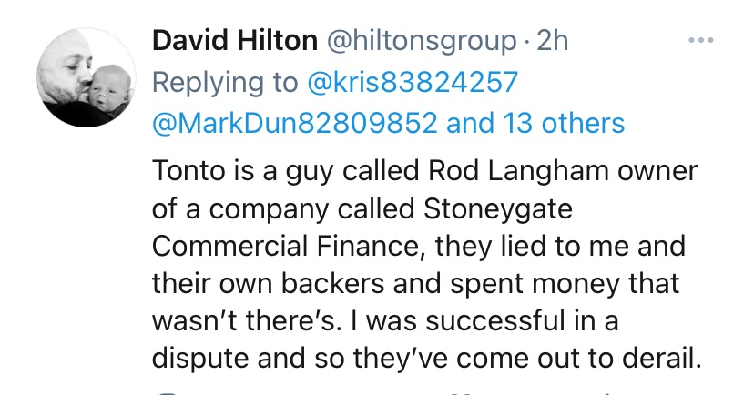 – A tweet by “@hiltonsofficial” (I’ve not bothered to correct the obvious mistakes) confirms a dispute with Rod Langham and reads as follows – “Tonto is a guy called Rod Langham owner of a company called Stoneygate Commercial Finance, they lied to me and their own backers and spent money that wasn’t there’s. I was successful in a dispute and so they’ve come out to derail”.